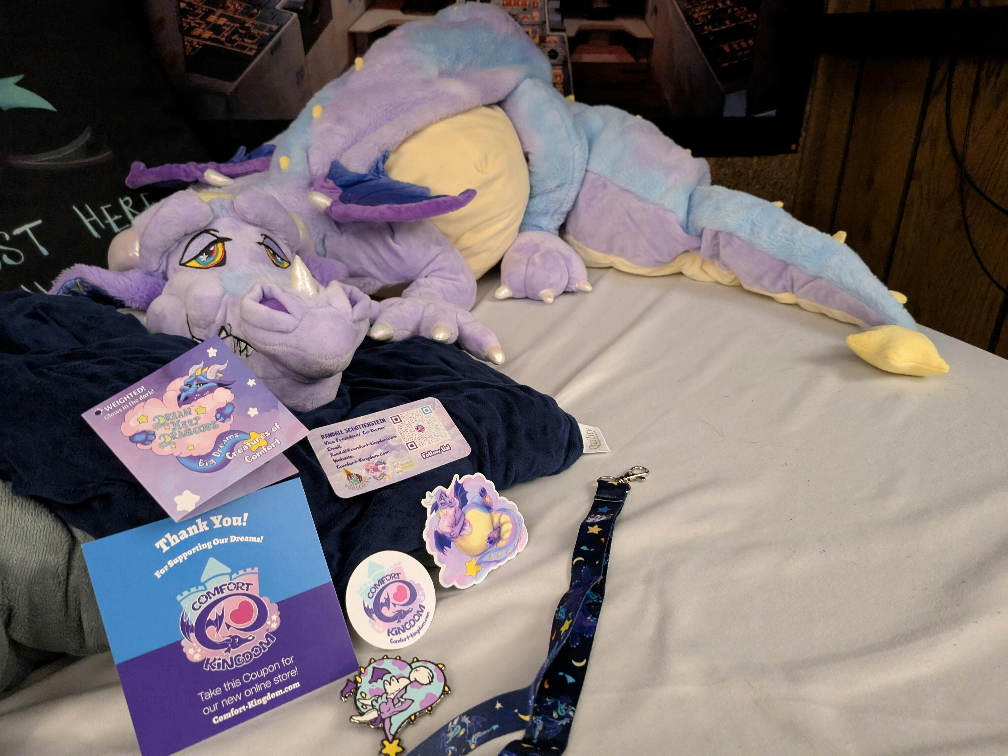 Beautiful dragons that make comfortable body pillows. They are shipped with a bit less fill to fit into boxes, but this is an opportunity to pick an organic fill to fluff up your dragon the rest of the way. Love the designs. Good luck with your next runs and the online store